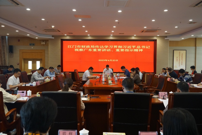 4月20日,江门市财政局召开局党组(扩大)会议,传达学习贯彻习近平总书记视察广东重要讲话、重要指示精神,全省、全市传达学习贯彻习近平总书记视察广东重要讲话重要指示精神干部大会精神,对全局贯彻落实工作作出部署安排。市财政局党组书记、局长王远林同志主持会议并讲话。