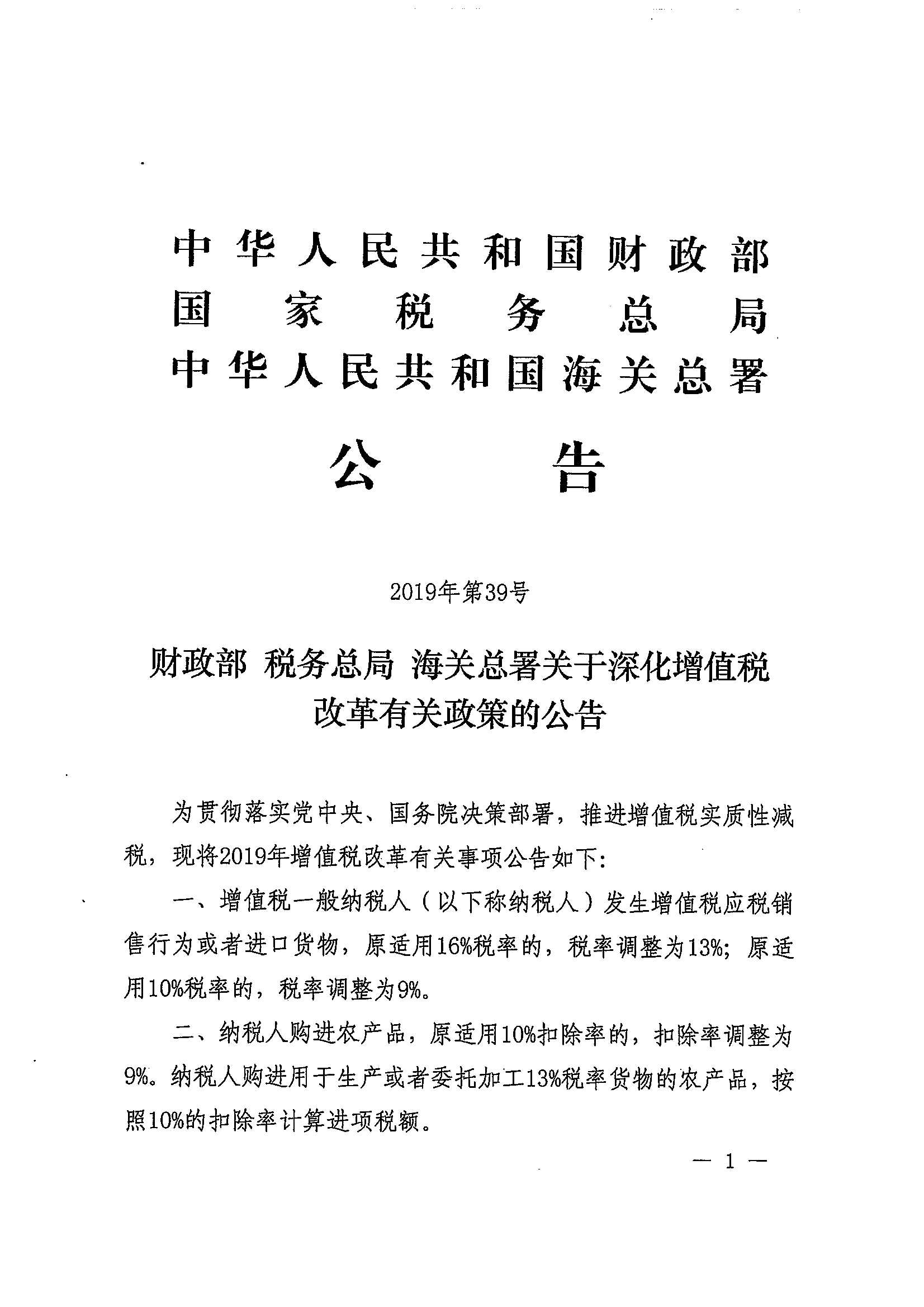 财政部 税务总局 海关总署关于深化增值税改革有关政策的公告