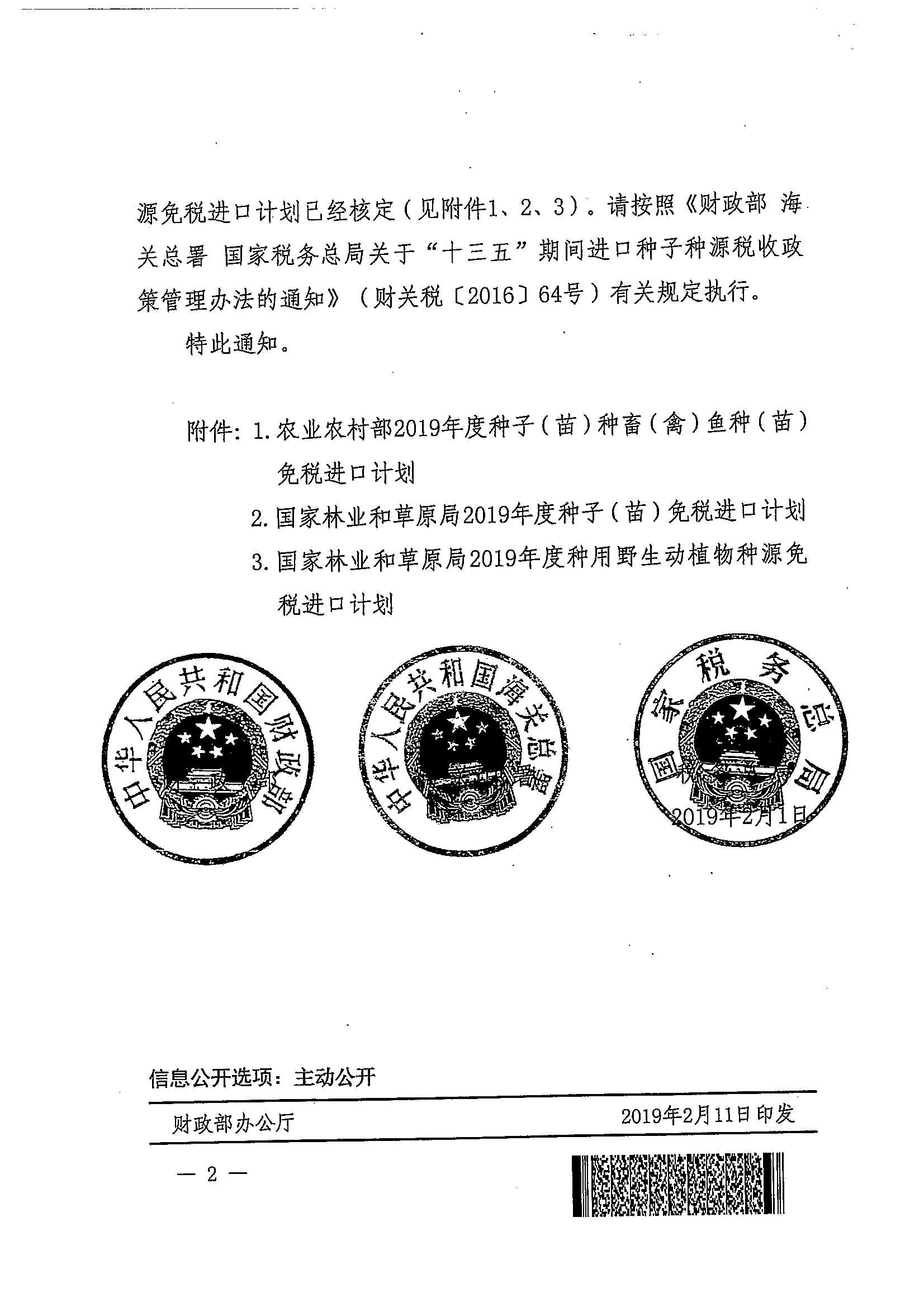 财政部 海关总署 税务总局关于2019年度种子种源免税进口计划的通知