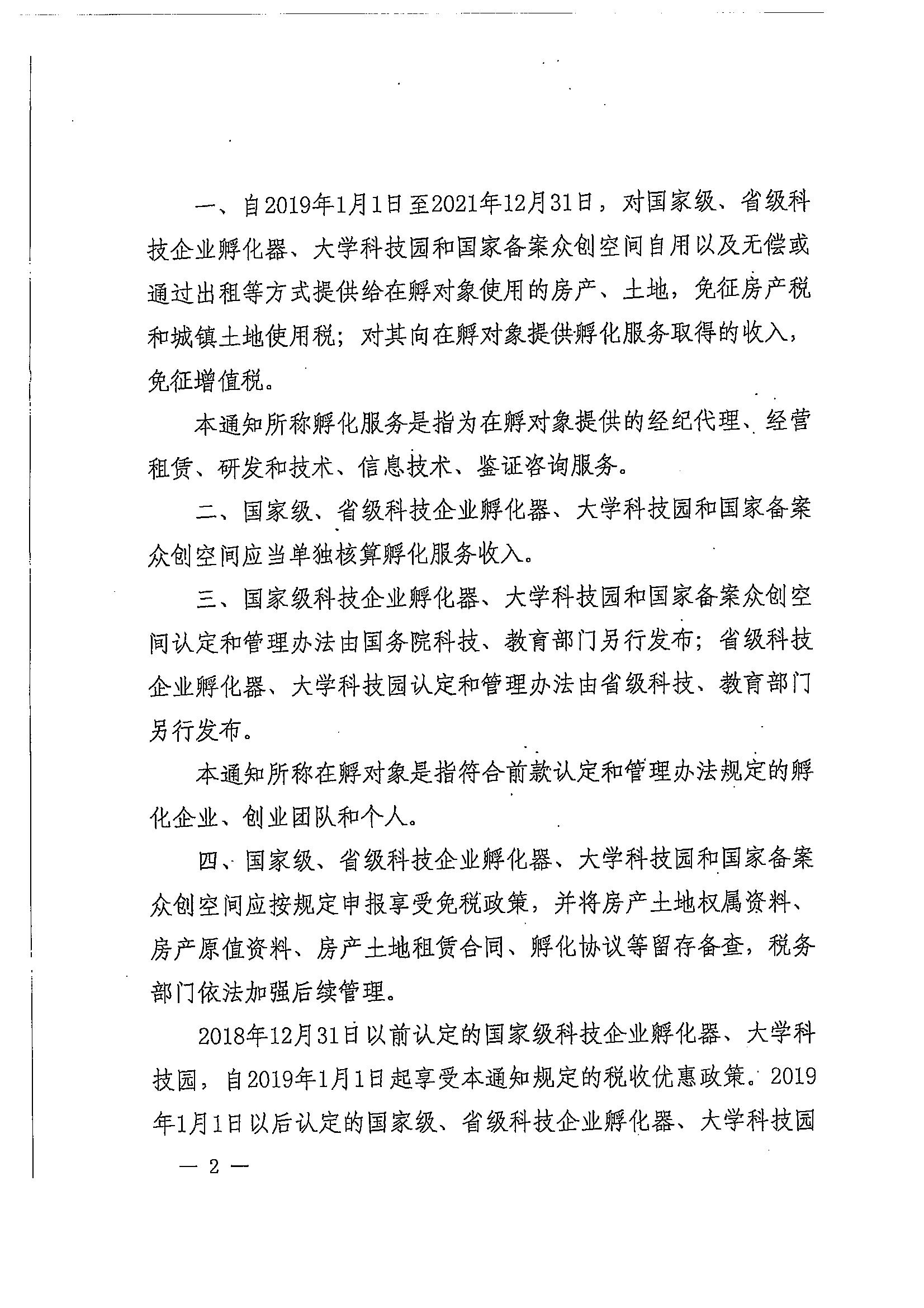 财政部 税务总局 科技部 教育部关于科技企业孵化器 大学科技园和众创空间税收政策的通知
