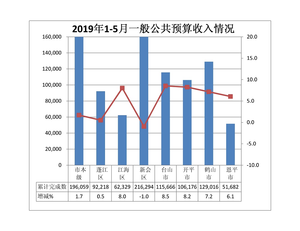 1-5月,全市一般公共预算收入完成96.94亿元,同比增长3.8%。其中税收收入完成66.03亿元,同比下降5.4%,占一般公共预算收入的比重为68.11%。市本级完成19.61亿元,同比增长1.7%。各市(区)完成情况:蓬江9.22亿元,增长0.5%;江海6.23亿元,增长8%;新会21.63亿元,下降1%;台山11.57亿元,增长8.5%;开平10.62亿元,增长8.2%;鹤山12.9亿元,增长7.2%;恩平5.17亿元,增长6.1%。