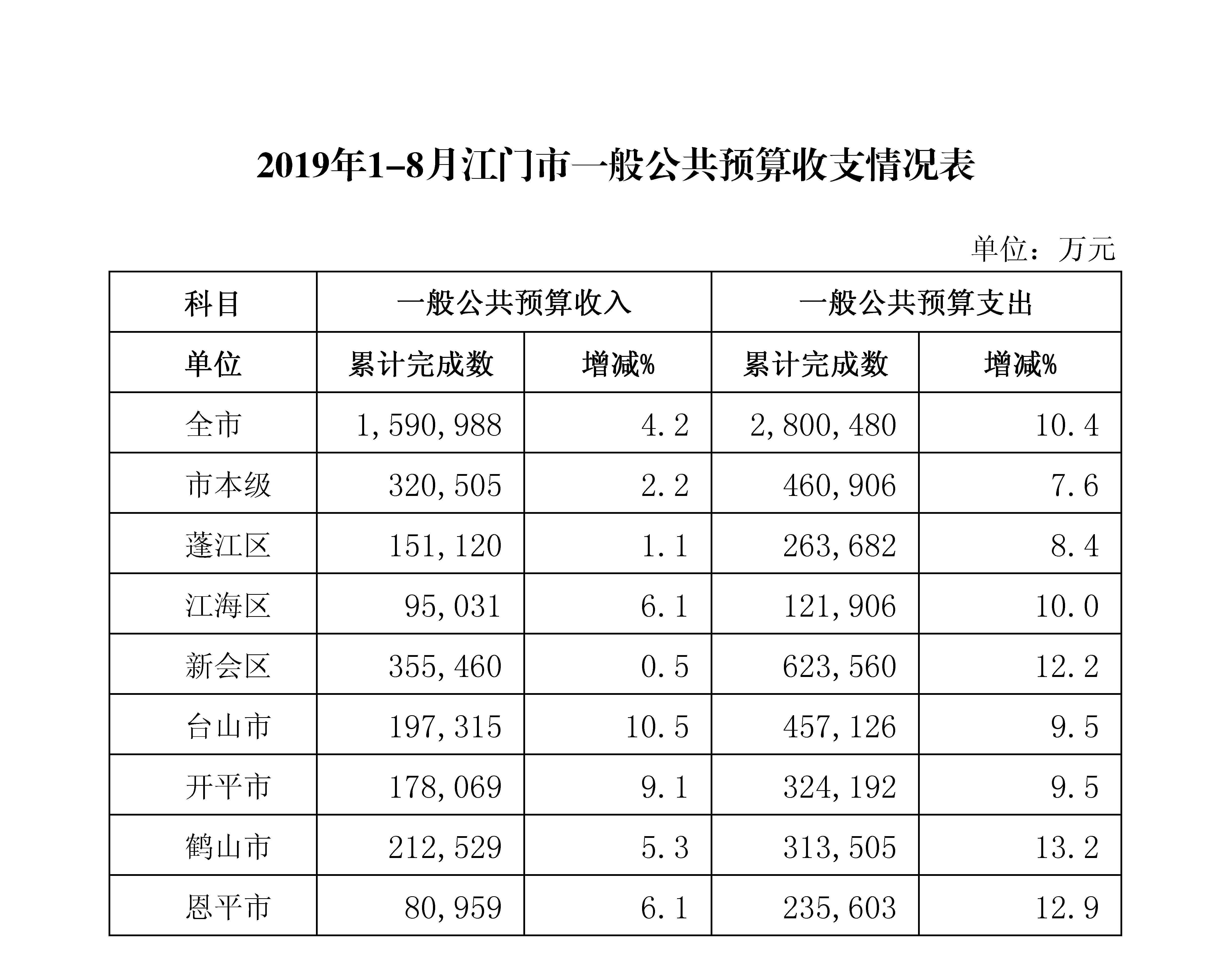 1-8月,全市一般公共预算支出完成280.05亿元,同比增长10.4%。市本级完成46.09亿元,增长7.6%。各市(区)完成情况:蓬江26.37亿元,增长8.4%;江海12.19亿元,增长10%;新会62.36亿元,增长12.2%;台山45.71亿元,增长9.5%;开平32.42亿元,增长9.5%;鹤山31.35亿元,增长13.2%;恩平23.56亿元,增长12.9%。