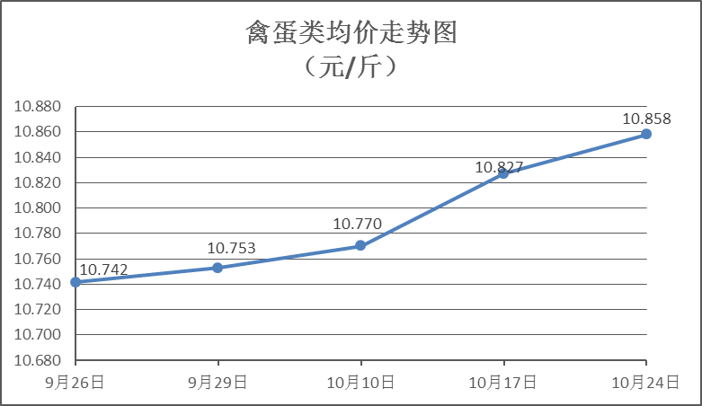 禽蛋类商品价格总体略涨。本周所监测的6种禽蛋类商品价格波动情况为5涨1跌,综合零售均价为10.858元/斤,环比上涨0.29%。其中:白条鸡、白条鸭零售均价分别为每斤20.34元、15.32元,环比分别上涨0.15%、上涨0.20%;红壳鸡蛋、鸭蛋零售均价分别为每斤6.80元、7.45元,环比分别上涨0.89%、上涨0.54%。