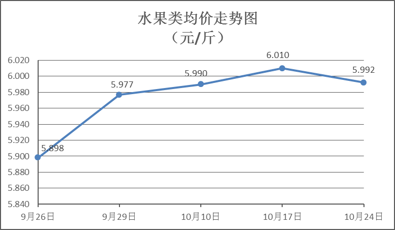 水果类商品价格略有下降。本周所监测的6种水果商品价格波动情况为1涨4跌1平,综合零售均价为5.992元/斤,环比下降0.31%。其中橙子、葡萄、梨零售均价分别为每斤6.59元、11.39元、5.19元,环比分别下降0.45%、下降0.35%、下降0.57%。