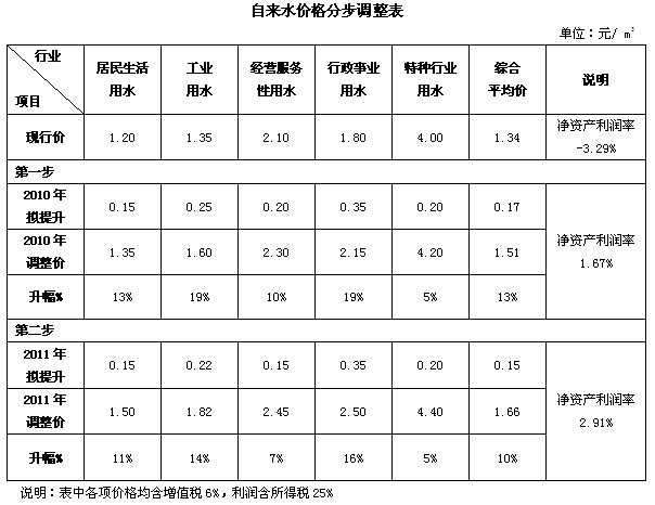采取一次听证,分二步实施的办法,分别在2010年及2011年按计划分步调整水价,最终达到综合平均水价由现行的1.34元/ m3调整到1.66元/ m3(含税,下同)。其中:居民水价由1.20元/ m3调为1.50元/ m3;工业水价由1.35元/ m3调为1.82元/ m3;经营服务水价由2.10元/ m3调为2.45元/ m3;行政事业水价由1.80元/ m3调为2.50元/ m3;特种水价由4.00元/ m3调为4.40元/ m3。(具体分步调整方案详见下表)