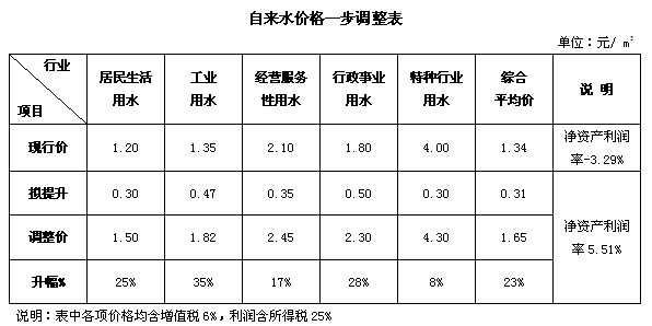 水价调整一步到位。综合平均水价由现行的1.34元/ m3一步调整到1.65元/ m3(全部含税,下同),调升幅度23%,其中:居民水价由1.20元/ m3调为1.50元/ m3;工业水价由1.35元/ m3调为1.82元/ m3;经营服务水价由2.10元/ m3调为2.45元/ m3;行政事业水价由1.80元/ m3调为2.30元/ m3;特种水价由4.00元/ m3调为4.30元/ m3。