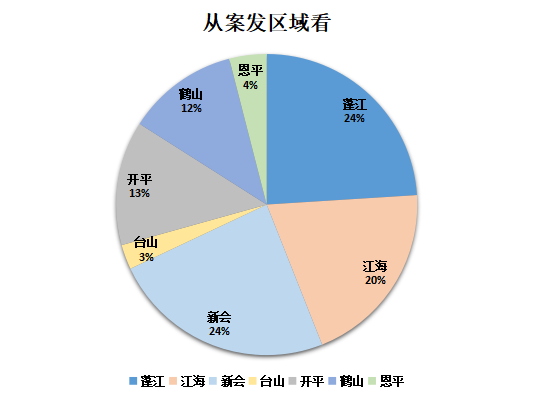 9月5日至9月11日案发区域及发案数:蓬江18起,江海15起,新会18起,台山2起,开平10起,鹤山9起,恩平3起。