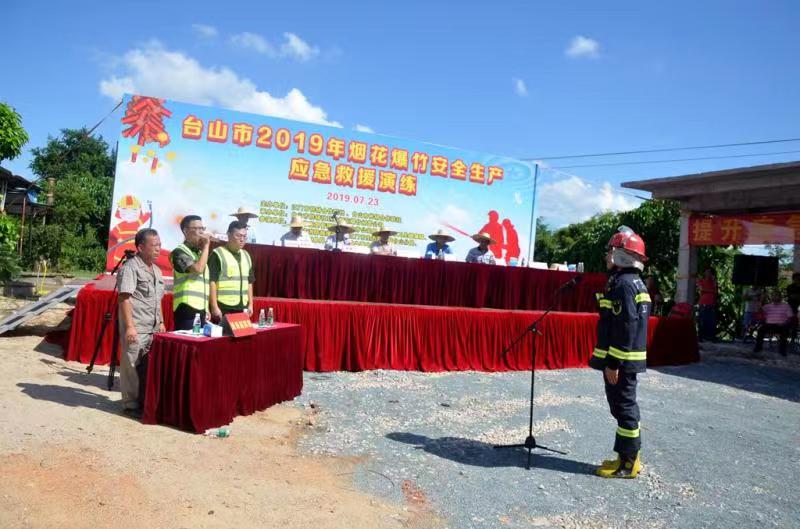 7月23日下午,江门市供销社、台山市供销社联合台山市应急管理局、台山市公安局、台山市卫生健康局、台山市消防救援大队、江门市生态环境局台山分局、台山市气象局、台城街道办等部门,在台山市供销社弘业烟花爆竹经营公司仓库开展台山市2019年烟花爆竹安全生产事故应急救援演练。江门市供销社党组成员、副主任莫松声,台山市供销社党组书记、主任李健壮出席演练活动,各镇(街)安监局代表、台山市供销社系统干部职工及各镇烟花爆竹零售点负责人共一百多名人员到现场观摩学习。