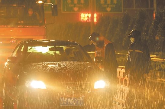 △昨日凌晨2点,江门大道测温点工作人员冒着大雨坚持工作。 周华东 摄
