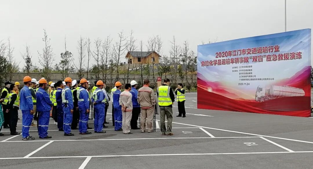 其实,这是11月24日,由江门市交通运输局联合开平市、恩平市交通运输局和江门市华润燃气有限公司、广东通驿高速公路服务区有限公司粤西分公司、广东粤运交通拯救有限公司第三分公司和危化品运输企业,在开阳高速大槐服务区组织开展的2020年江门市交通运输行业危险化学品运输车辆事故“双盲”应急救援演练的现场。