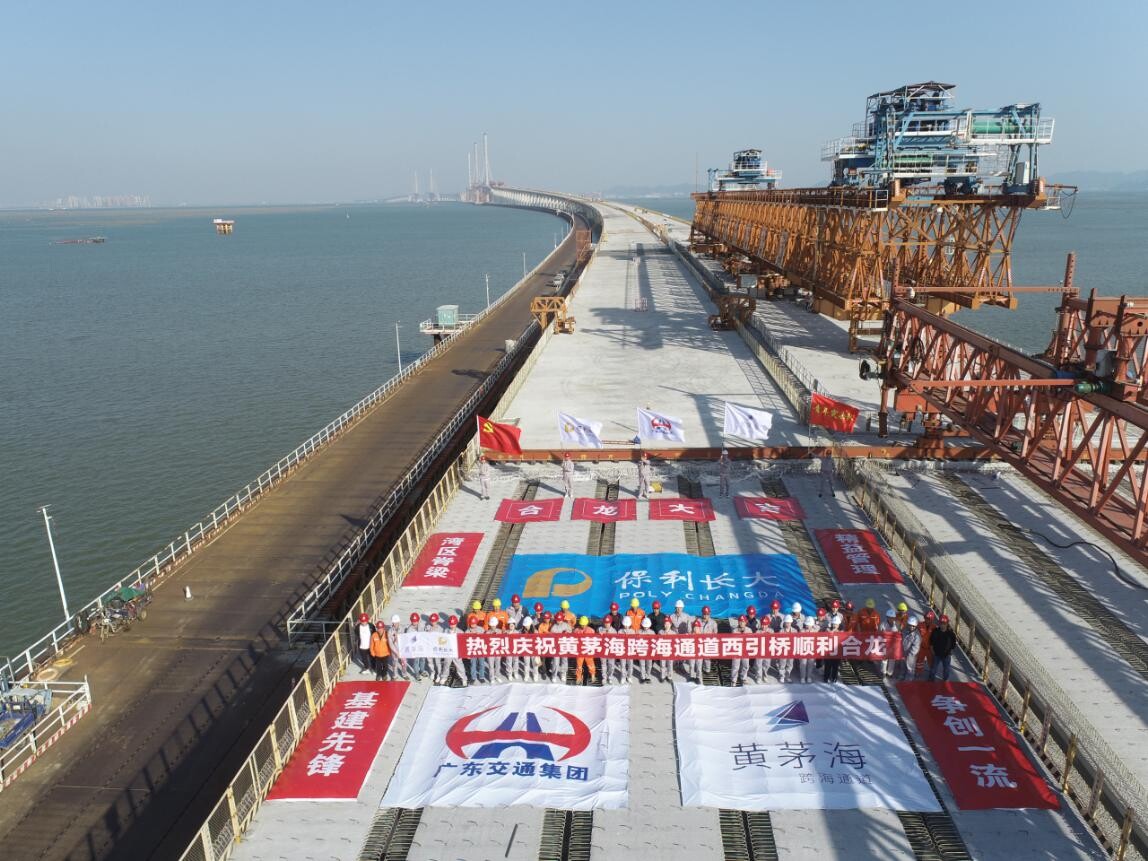 12月7日下午3时,黄茅海跨海通道浅滩区最后一片长40米、重172吨的小箱梁平稳地落在盖梁上,黄茅海跨海通道西引桥顺利合龙,开启桥面铺装新篇章,为项目全线合龙贯通奠定坚实基础。