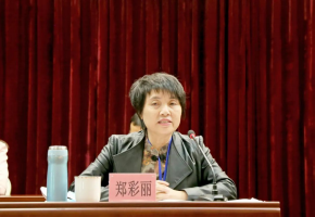 (图为复评组第一组组长郑彩丽在台山市复评督导验收反馈会上讲话)