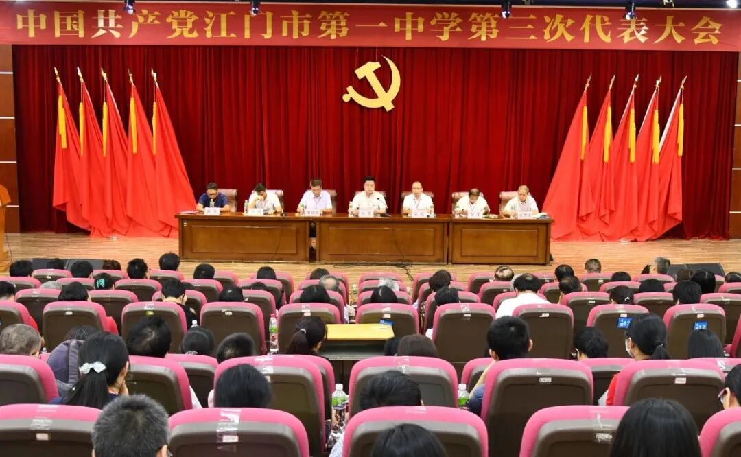 7月23日上午,中国共产党江门市第一中学第三次代表大会在学校图书馆学术报告厅召开,101名党员代表参加了本次大会。市教育局党组书记、局长张璐同志以及学校四个民主党派代表受邀出席。会议由党委委员、副校长唐健荣主持,在全体肃立、奏唱国歌的庄严气氛中开幕。大会全面总结了中共江门一中第二届委员会的工作情况,确定了今后五年的奋斗方向,选举产生了新一届学校党委和学校纪委。