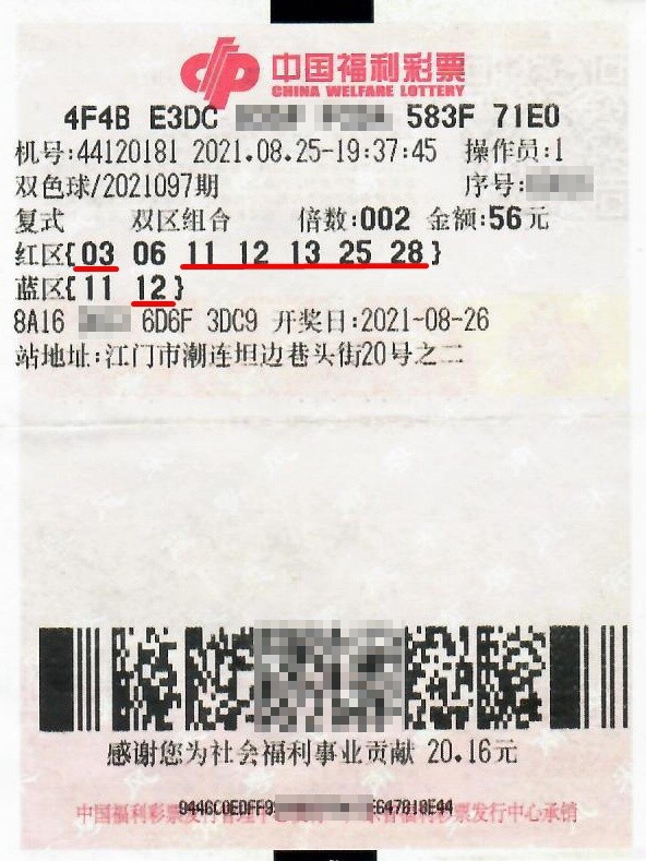 8月26日星期四,双色球第2021097期开奖,当期的开奖号码为红球03、11、12、13、25、28,蓝球号码12。当期全国开出一等奖45注,单注奖金5,323,421元。二等奖359注,单注奖金50,675元。江门市蓬江区潮连坦边巷头街20号之二的第44120181号福彩投注站一彩民以一张56元“7+2”2倍投复式自选票,该票中得一等奖2注,二等奖2注,三等奖12注,四等奖12注,总奖金10,786,592元。8月30日上午,江门市福彩中心为站点举行庆祝2021年首个福彩千万元大奖宣传活动,中心主任吴占求为站点负责人颁发中奖证书和宣传费奖励。