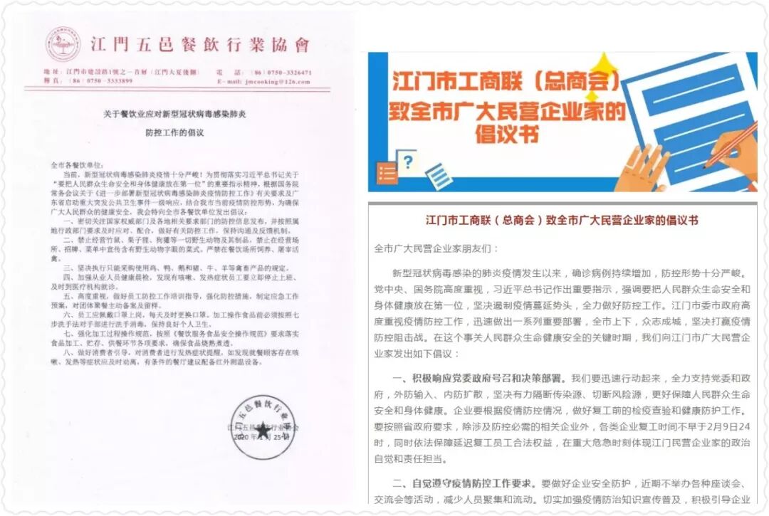 我市涉及群众生活、民生领域的物业管理、餐饮、酒类等领域的行业协会,向会员单位及行业发出紧急倡议、温馨提示等,46家全市性行业协会商会、25家异地商会呼吁暂停人员聚焦活动,支持鼓励会员企业加急生产,调集物资,保障供应,坚决杜绝囤积居奇、哄抬物价行为。江门五邑餐饮行业协会呼吁全市各餐饮单位严格落实一级响应,密切关注政府部门发布的防控信息及要求,并认真贯彻落实,加强防控措施,制定应急预案。江门市总商会向全市广大民营企业家发出倡议书,鼓励、引导和支持各民营企业积极响应党委政府号召和决策部署、自觉遵守疫情防控工作要求、切实履行民营企业家责任与担当,为打赢疫情防控阻击战贡献江门民企力量。