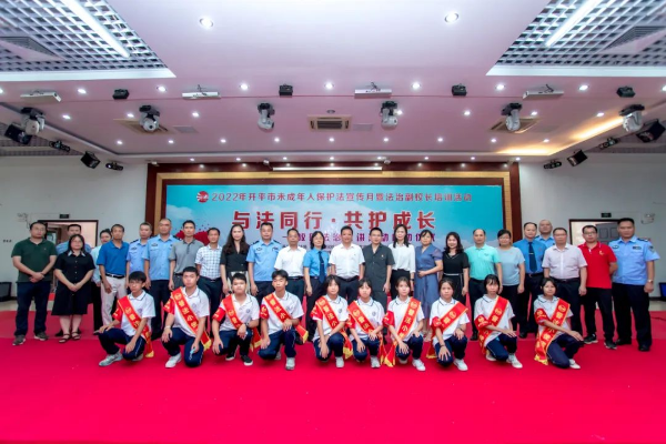 为深入学习宣传贯彻习近平法治思想,营造关爱保护未成年人健康成长的浓厚社会氛围,6月23日,开平市民政局联合开平市司法局、人民法院、人民检察院、教育局、公安局以及团委、妇联、普法办等单位在开平市吴汉良理工学校举办以“与法同行 共护未来”为主题的未成年人保护法宣传月暨法治副校长培训活动。