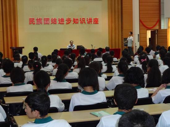 “我国有55个少数民族,少数民族人口已超过1亿,虽然只占全国总人口的8.41%,但这个数目已经达到国际上一个大国的人口数量……要促进民族团结,构建平等、团结、互助与和谐的民族关系。”9月19日,为推动江门市民族团结进步事业的发展,建设幸福侨乡营造良好的社会环境,市民族宗教局邀请广东省民族学会理事、五邑大学副教授冈虎为江门幼儿师范学校、培英高中两所学校近7000名师生分别举办了一场民族团结进步知识讲座。