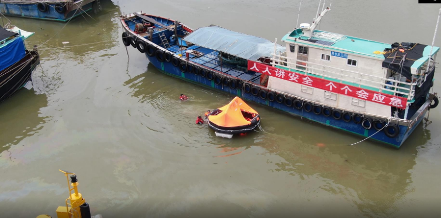 情景模拟演练环节分别设置了火灾和落水两个情景。场景一:模拟某渔船发生火灾。现场船长发现突发火警,立即报警。接到报警后,各相关部门立即启动渔船突发火警应急预案,马上奔赴现场,出动消防车、消防艇以及使用岸上消防栓对着火渔船实施喷水灭火行动。场景二:渔船所有船员穿好救生衣,其中3名船员从船上跳入水中,模拟人员意外落水。船长发现船上人员落水后,使用船上救生圈、救生筏救援。