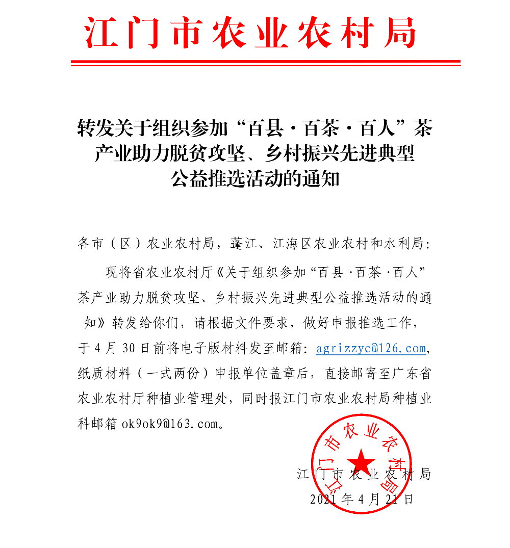 转发关于组织参加“百县·百茶·百人”茶产业助力脱贫攻坚、乡村振兴先进典型公益推选活动的通知