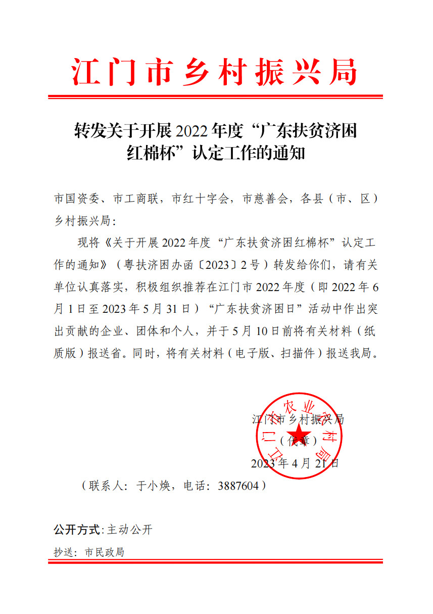 转发关于开展 2022 年度“广东扶贫济困红棉杯”认定工作的通知