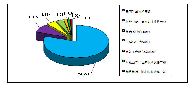 在本季度求职者中,具有各类技术职称或技术资格等级的占求职者总数的20.05%,其中,具有初、中级职称的专业技术人员和技能人员占16.54%,具有高级职称的专业技术人员和高级技能人员仅占3.51%。