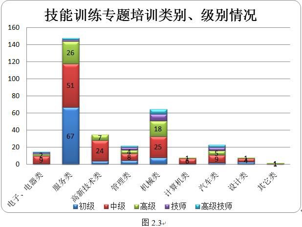 3.技能训练专题情况。数据显示,培训项目中服务类、机械类和高新技术类所占比例较多,分别为43%、16%、10%,主要集中在中级和高级。