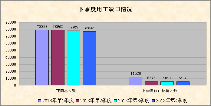 第四季度,从企业用工及人力资源服务平台信息系统和全市人力资源服务机构的数据统计,全市用人单位登记招聘职位数共36177个,登记求职人数共29911人,总体职位供求比为1:0.83(招聘职位数为1,求职人数为 0.83,下同);全市人力资源市场总体用工缺口为6266人。