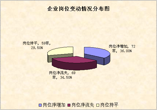 12月末全市监测企业发生岗位数量环比净增加的有72家,占36.0%,共增加岗位695个,环比增加1.71%;岗位数量环比净流失的有69家,占34.5%,共减少岗位445个,环比减少1.16%;岗位数量保持不变的有59家,占29.5%。