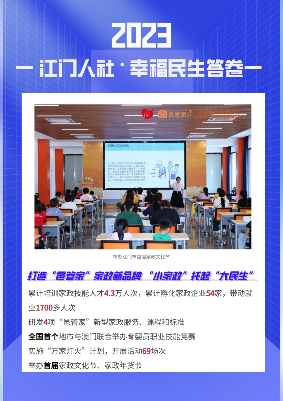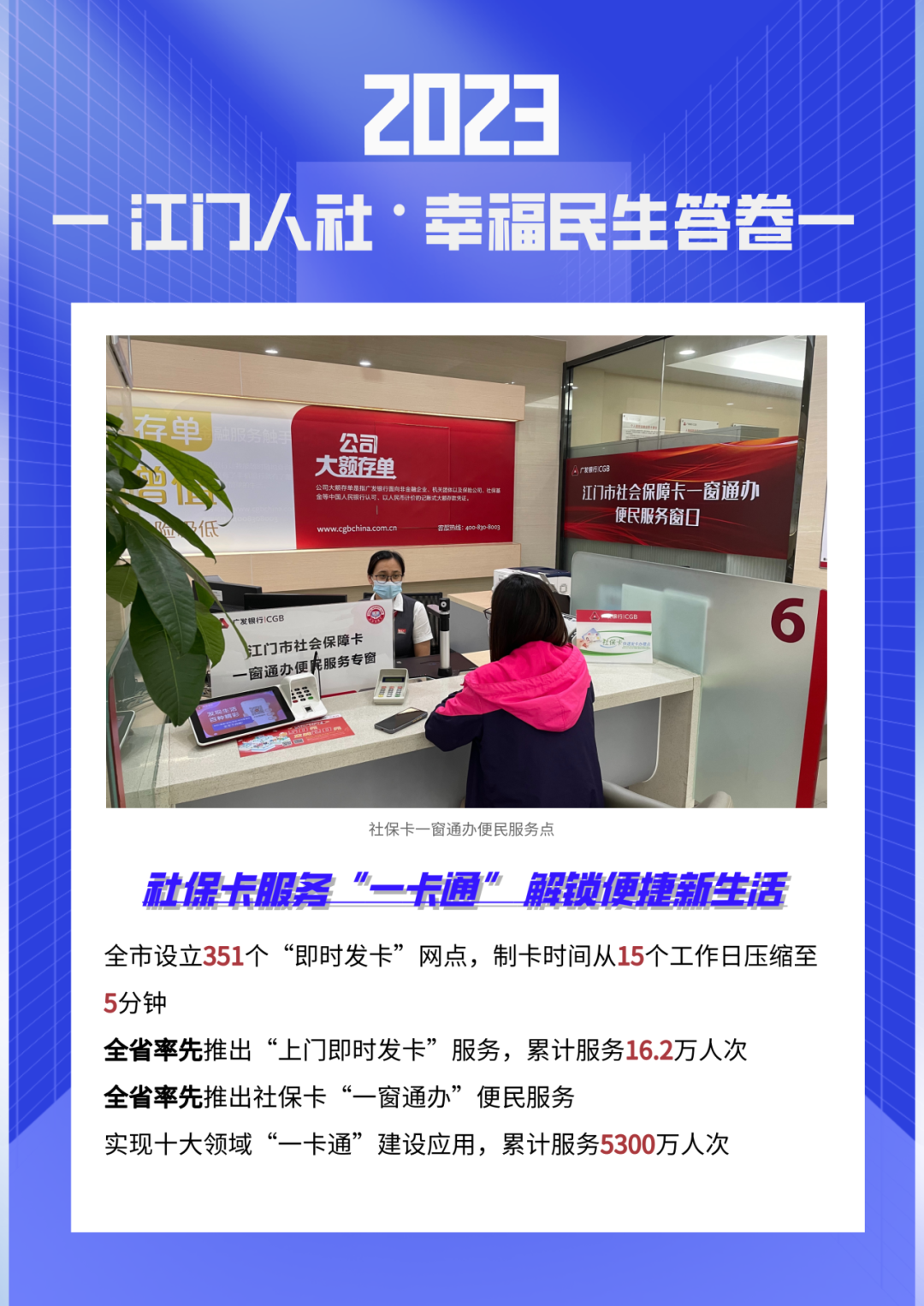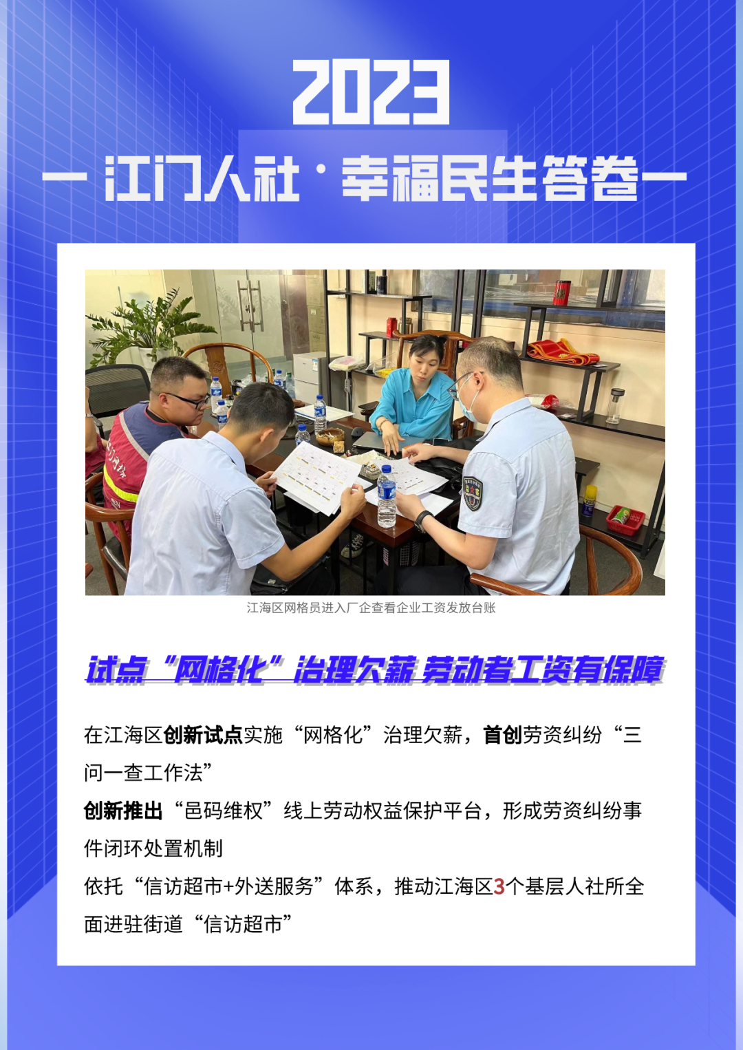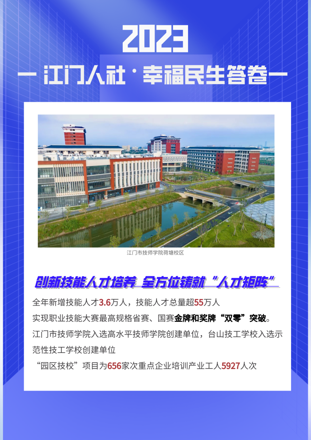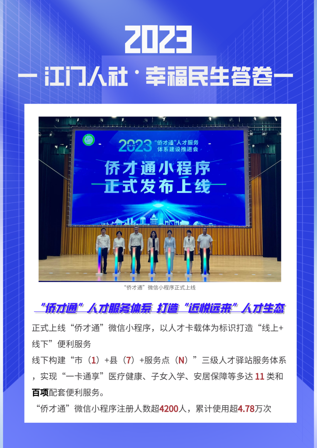 2023年来,江门市人力资源和社会保障局认真贯彻落实省委“1310”具体部署和市委“1+6+3”工作安排,坚持以人民为中心的发展思想,聚焦事关企业和群众切身利益的就业、社保、收入分配、劳动关系、人事人才等问题,不断加大惠企利民工作力度,推动各项工作取得新突破、新成效,交出了一份份硕果累累的答卷。