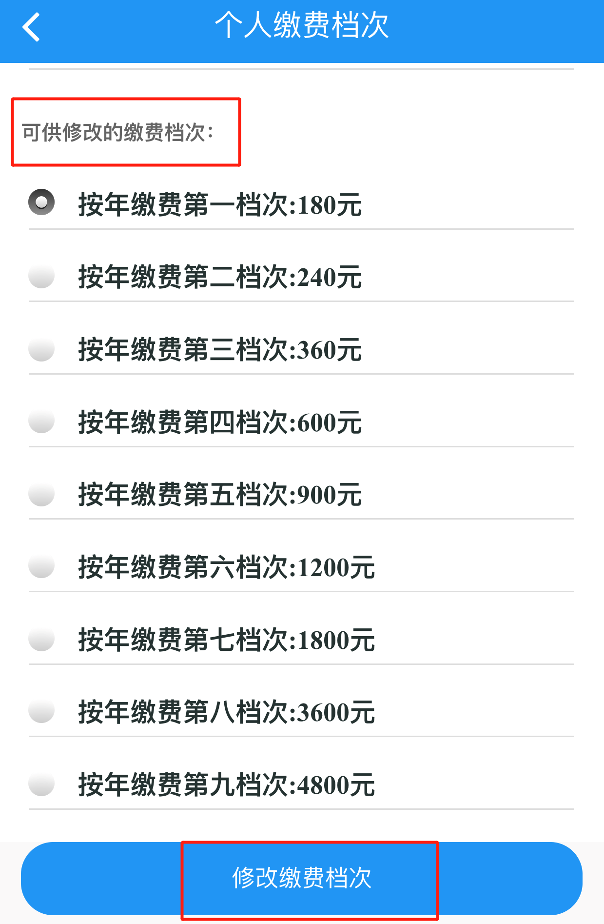 4.选择相应的缴费档次,点击“修改缴费档次”,完成城乡居保缴费档次修改。