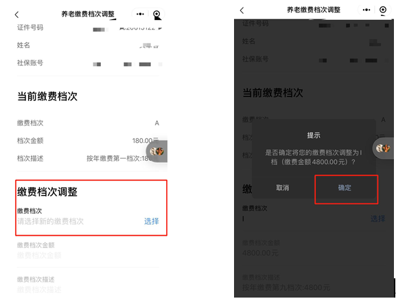 (四)选择相应的缴费档次,点击“修改缴费档次”,完成城乡居保缴费档次修改。其中,缴费档次为每年180元、240元、360元、600元、900元、1200元、1800元、3600元、4800元九个档次。在一个自然年度内,参保人只能选择一个缴费标准。