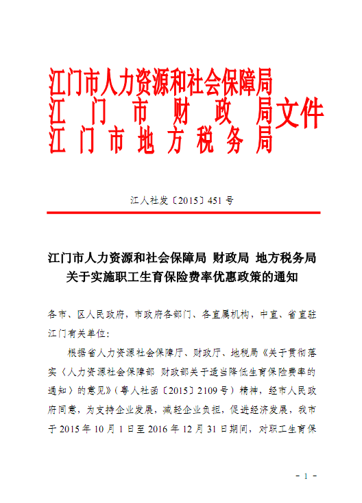 《江门市人力资源和社会保障局财政局地方税务局关于实施职工生育保险费率优惠政策的通知》