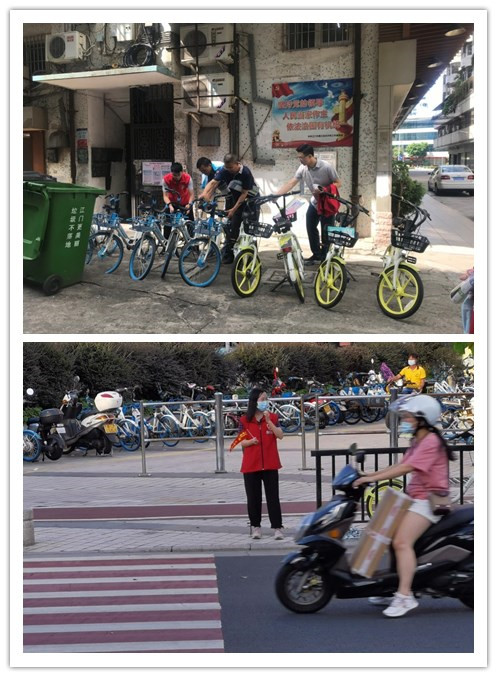 (三)善当引导员,让创文成效走进群众心里。党员义工们在重要交通路口尽职尽责地进行道路交通安全引导。遇到驾驶员、行人不理解的情况,党员们耐心地进行解释、沟通,进行道路交通安全教育,为社区的群众起到了良好的带头作用。同时,党员们将乱停放的共享单车统一停放到固定区域,并对使用共享单车的市民开展文明引导,进一步提升社区居民的文明素养。