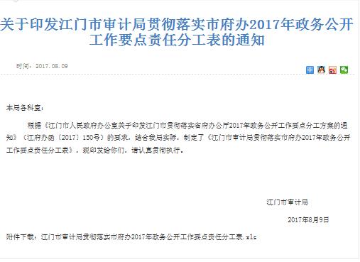三是做好年度 要点工作。结合省、市 工作重点,编制并向社会公布了我局2017年 工作要点责任分工表,按时按要求公开了市本级预算执行和其他财政收支审计工作报告、重大政策措施落实跟踪审计情况等审计信息。同时,强化 ,首次对财政预算审计工作报告进行同步解读。另外,按照《国务院办公厅关于推进公共资源配置领域政府信息公开的意见》要求,加大对公共资源配置领域的审计监督力度,并按要求做好相关公开工作。