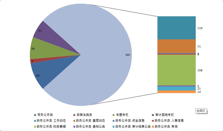 2017年,在局门户网站发布政府信息517条,包括 类信息397条,党务公开类信息46条,政策法规类信息7条,专题专栏发布36条,审计园地专栏发布31条。其中 类信息有工作动态119条、基层动态71条、资金信息4条、人事信息5条、时政要闻类信息158条、通知公告5条,审计结果公告21条,执行公开、管理公开等其他信息14条。