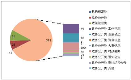 2018年,在局门户网站发布政府信息421条,主要包括 类信息313条,党务公开类信息26条,政策法规类信息31条,专题专栏发布9条,审计园地专栏发布37条。其中 类信息有工作动态91条、基层动态82条、资金信息4条、人事信息2条、时政要闻类信息100条、通知公告10条,审计结果公告21条,其他信息3条。