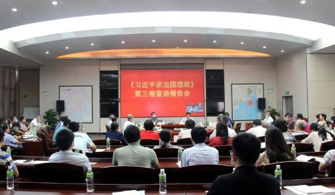 8月27日,市生态环境局举办《习近平谈治国理政》第三卷宣讲报告会,会议邀请市委宣讲团成员、市委宣传部副部长、新闻出版局局长杨林贵作专题辅导报告。市生态环境局机关全体党员、各科室、各事业单位负责人参加了主会场的报告会,各市(区)生态环境分局党员干部以视频会议的形式参加学习。