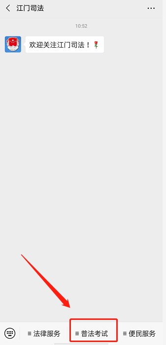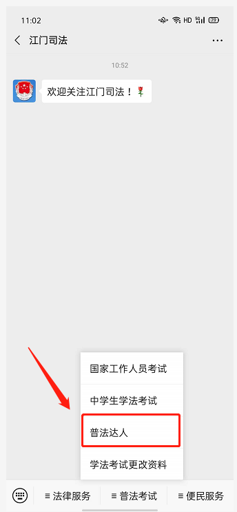 (二)登录“江门司法”微信公众号后,进入底部菜单栏“普法考试”→点击“普法达人”按提示进行在线竞赛。