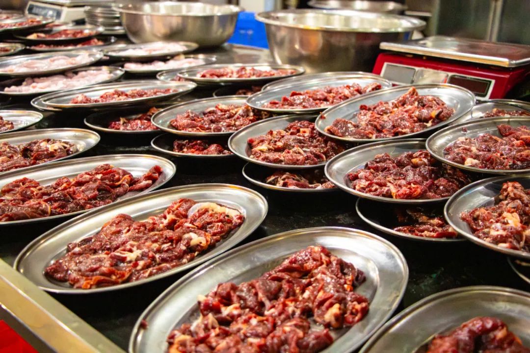 走进五洞村最大的牛餐馆——大众牛餐馆,选餐区内一碟碟切好的新鲜牛肉任君挑选,不到半小时,数百张餐桌座无虚席、烟火升腾,食客们大快朵颐,尽情享受着美味的牛肉盛宴……