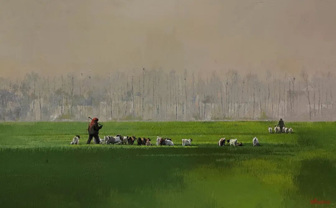 清晨的薄雾还没有散去,牧羊人领着羊群在麦田里悠闲地漫步,自在地享受着田野的宁静。这个时节的麦苗长势太旺,对来年的丰收有影响,正好有羊儿啃食,压一压麦苗急切生长的心情。