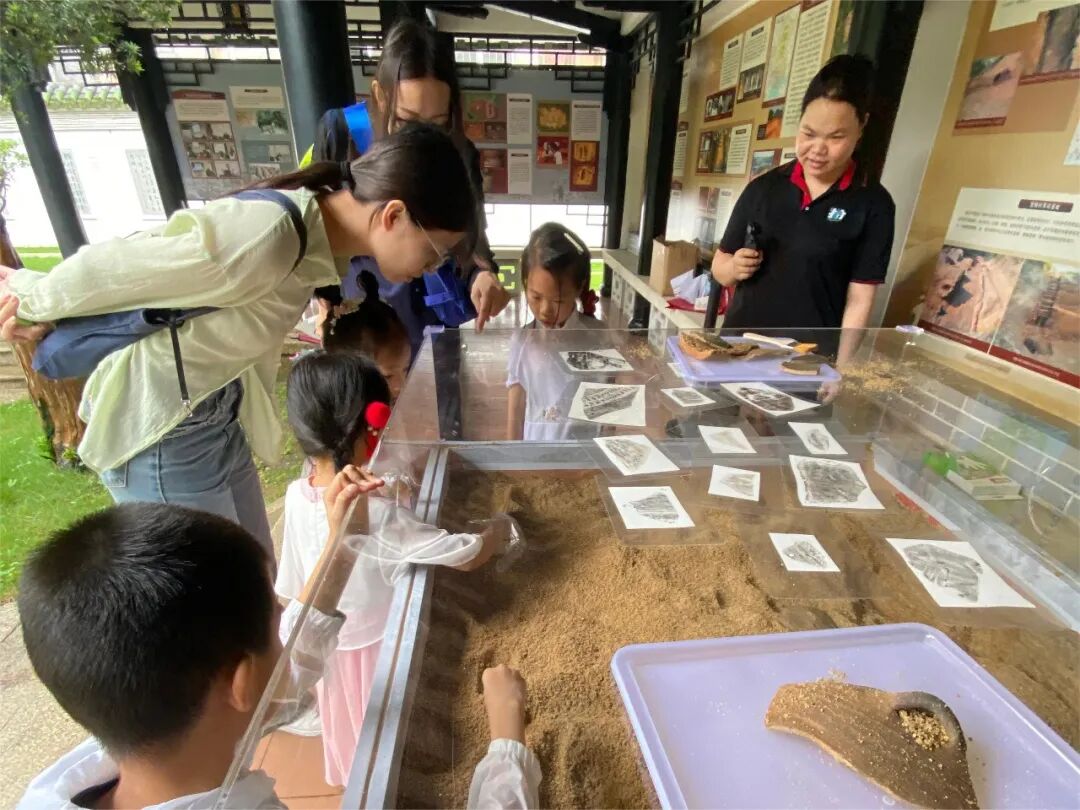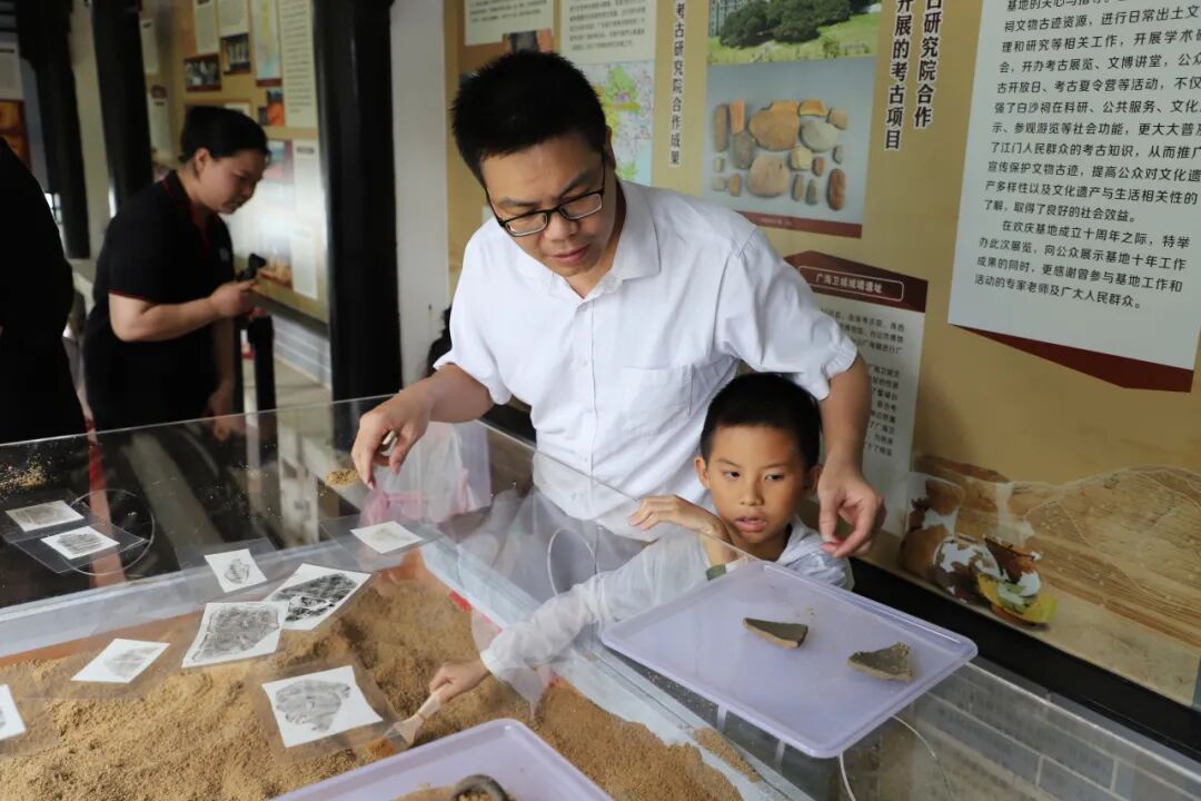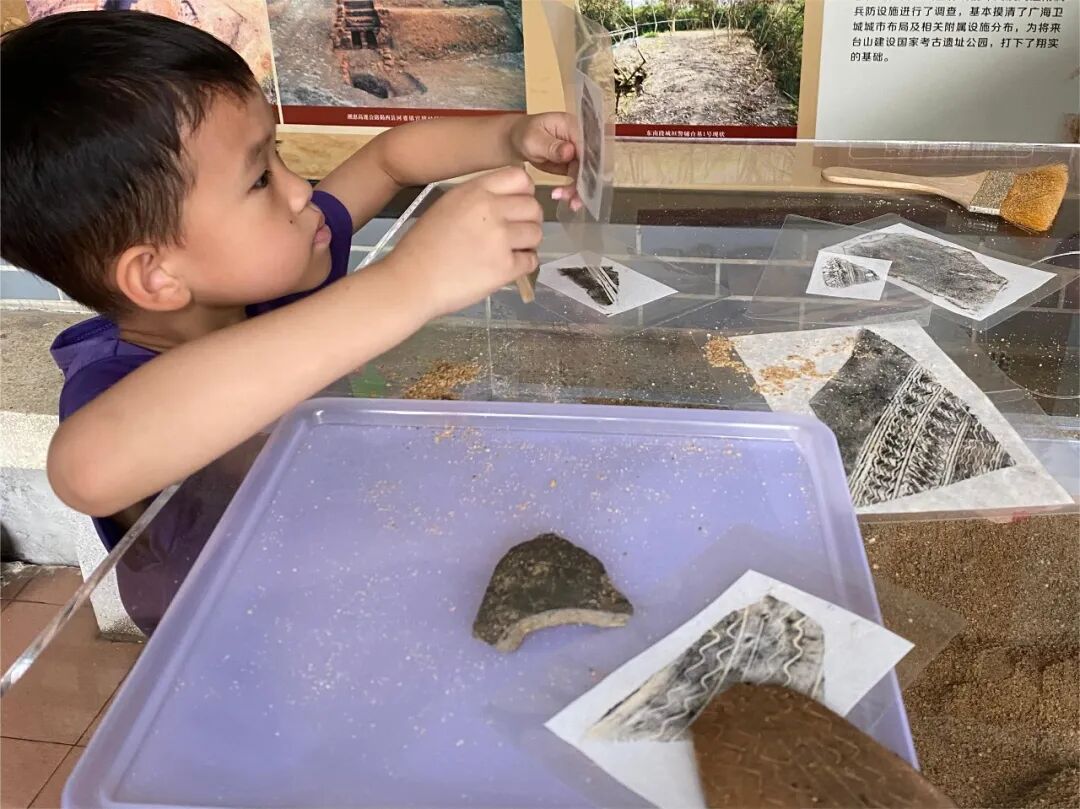 在广东省科技考古基地内,新设了考古知识长廊和全新的考古体验活动——考古沙盘。在工作人员的指引下,游客们可以在考古沙盘中使用工具发掘出碎陶片,并通过观察纹饰、肌理,找到对应的拓片。大家在活动中得以近距离感受考古发掘的魅力与乐趣。