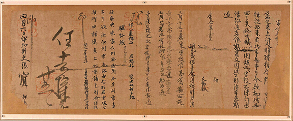 唐开元年间瓜州都督府颁给石染典的“过所”。石染典是新疆地区的一位商人,因出外经商而向官府申领通行证,后附有悬泉、常乐、苦水、盐池4处守捉(驻军部队)的关卡检查情况。
