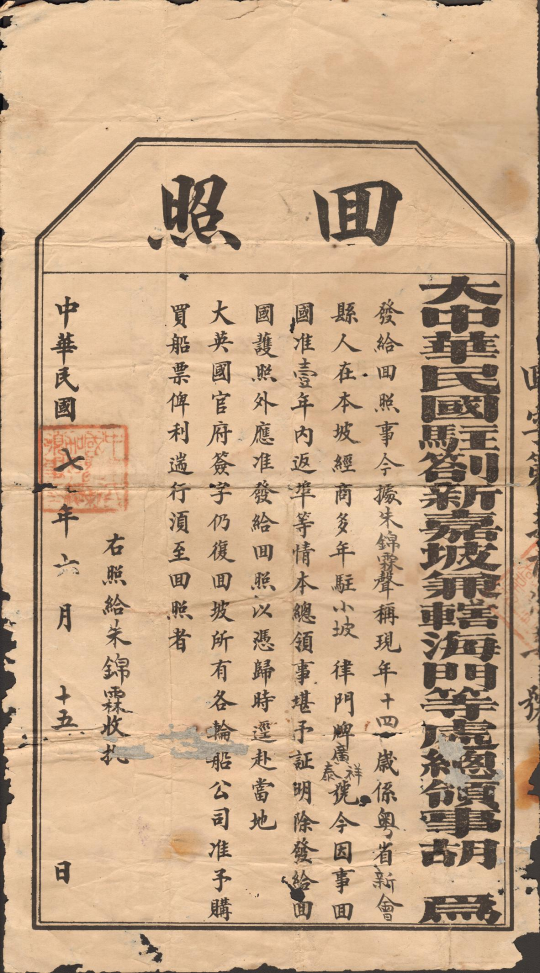 1918年驻扎新加坡兼辖海门等处总领事发给朱锦霖的回照