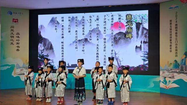为展示学员们的学习成果,诵读经典班的学员和馆员老师们用诵读、吟唱、演奏等丰富的表现形式,将耳熟能详的《论语》、岭南第一碑《慈元庙碑》、岭南古琴等在南国书香节的舞台上进行精彩呈现。多才多艺的孩子们,身着汉服,穿越岁月的长河,声情并茂地诵读中华经典,讲述国学故事,传承经典文化,给大家带来了一场视听盛宴。