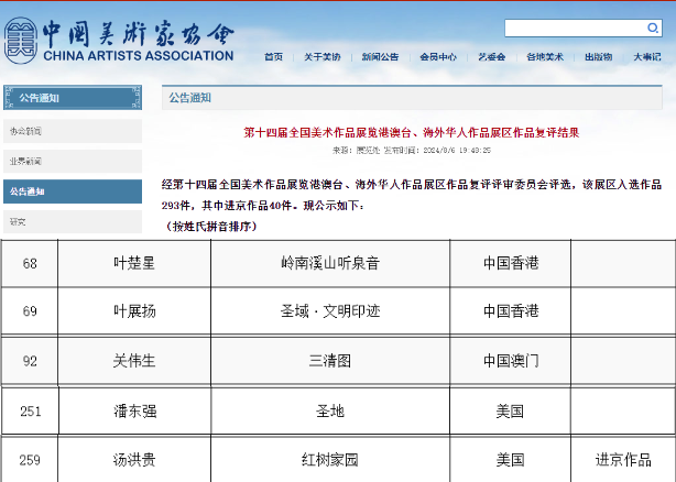 “庆祝中华人民共和国成立七十五周年——第十四届全国美术作品展览港澳台、海外华人作品展”共293件作品入选。江门作者叶楚星、叶展扬、关伟生、潘东强、汤洪贵作品成功入选此次展览。