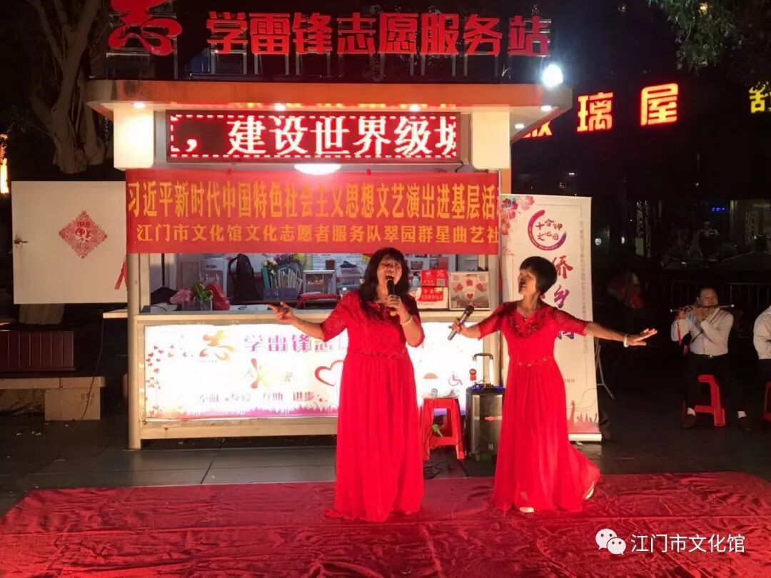 今年以来,家住江门东湖广场、元宝山公园、长堤公园、中山公园附近的市民朋友都熟悉了这样一幕场景:每逢周末晚上,来自江门市文化馆的“快乐文艺小分队”都会准时出现在以上几个地方,开展形多样式、内容丰富的文艺演出,为社区群众献上一道道精美丰盛的“文化大餐”。