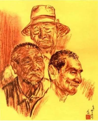 司徒乔,《三个老华工》,纸本彩色铅笔,48.3cm×39.4cm,1950年,现藏于中国美术馆