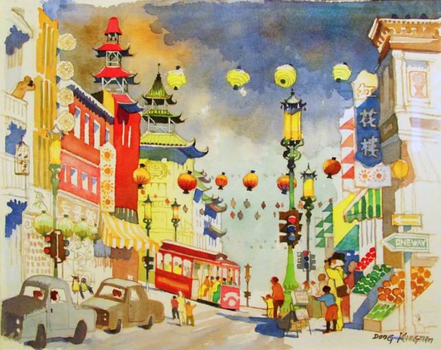本课程将通过欣赏江门台山籍美籍华裔水彩画家曾景文的反映唐人街内容的水彩画作品,感知艺术家笔下的海外唐人街景象和城市水彩艺术作品的魅力,重点了解早期海外华人在唐人街的社区生活情况。学生将认知归纳华人海外唐人街社区的基本视觉符号,如灯笼、中式屋檐、中文店招、英文店招、舞狮、鸟笼等。尝试学习曾景文水彩画的色彩表现手法,学习表达建筑的肌理并以立体画结构创作唐人街场景,用串灯点亮。