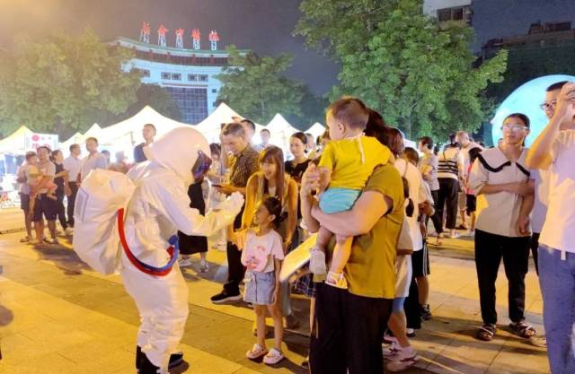 新会人民会堂举办的“星月交辉,乐享中秋”——太空主题音乐市集同样热闹。市民游客在品尝美食之余,与月球氛围装饰合照打卡,与宇航员小分队游戏互动,还能听一场月球主题音乐会,感受从“赏”月到“登”月的别样体验。