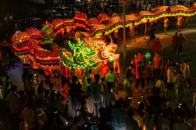 9月17日至18日,鹤山市桃源镇钱塘村委会开展钱塘彩龙巡游活动、精彩烟花秀,钱塘彩龙巡游过程中,游客、村民以及前来的亲朋好友穿过龙肚,祈求新年身体健康、心想事成、事事顺利。